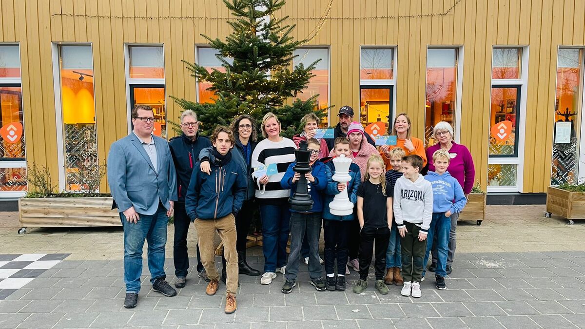 Op de foto zijn te zien het bestuur van de schaakclub in Akkrum met een aantal jonge leden en initiatiefnemer voor het buitenschaken Natasja Derksen, Elziena Taute van de bibliotheek met een aantal jonge leden en Alida Sieperda, zorgcoördinator van It Pakhûs samen met twee bewoners.