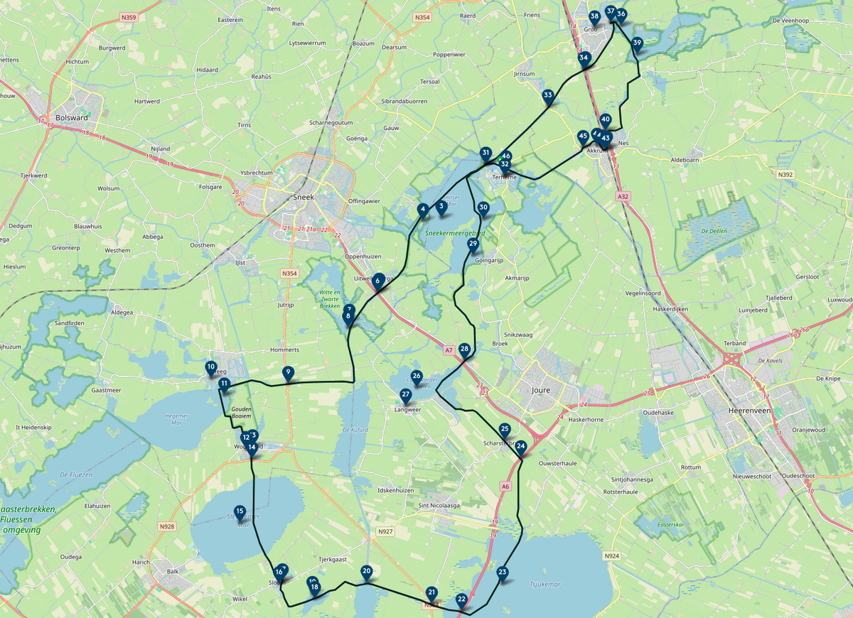De ‘Doorvaarroute Zuidwest Friesland & Grou’ is 76 kilometer lang en verbindt pittoreske dorpen, Elfstedenstadjes, sfeervolle havens en horeca langs een traject dat ook in de koudere maanden aantrekkelijk blijft. De route start en eindigt in Terherne en loopt via Elfstedenstad Sneek, het Starteiland in het Sneekermeer, Heeg, Woudsend en vervolgt over het Slotermeer richting Elfstedenstad Sloten. Hier kunnen bezoekers een stadswandeling maken en genieten van plaatselijke horeca die ook in de winter open is. De stadswandeling van VVV Waterland van Friesland is vooraf te bestellen via shopfriesland.nl