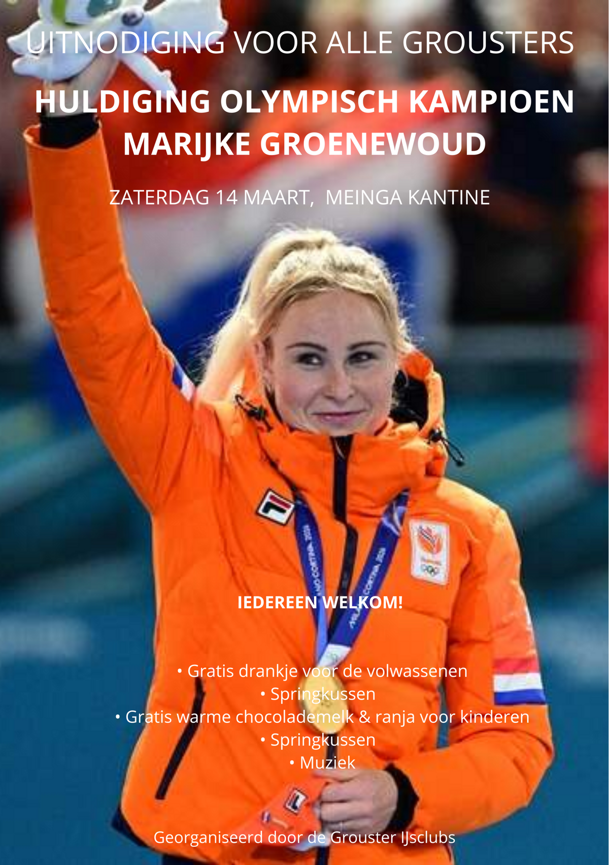 Op zaterdag 14 maart zal Olympisch Kampioene Marijke Groenewoud in Grou worden gehuldigd. De ijsclub ‘Grouw’ en de ijsclub ‘Foar It Jonge Folkje’ vinden, dat zij hiervoor in het zonnetje moet worden gezet en hebben hiervoor een programma gemaakt.